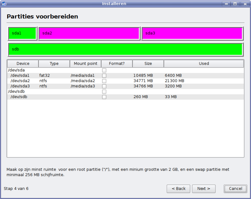 Als ik Kubuntu erin doe en dan schijf-indeler, dan doe ik handmatig en dan krijg ik het volgende