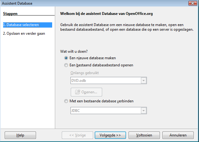 je moet, zoals eerder vermeld, OpenOffice.org Base apart installeren. Dat welkomstscherm lijkt me onnodig.