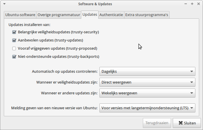 In 14.04 in Software & Updates onder Updates zie ik dat ¨unsupported updates¨ staat aangevinkt....
