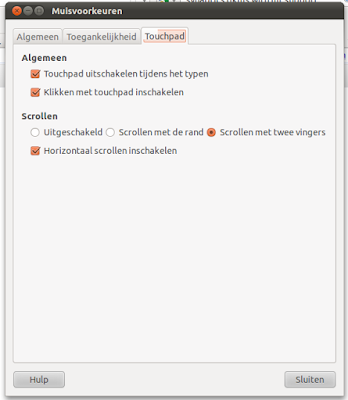 Als je na het installeren in de menubalk van Ubuntu gaat naar "Systeem/Voorkeuren/Muis", tabblad "touchpad", zie je dat de optie "scrollen met twee vingers" geselecteerd is. Deze optie was voor de installatie niet te selecteren!