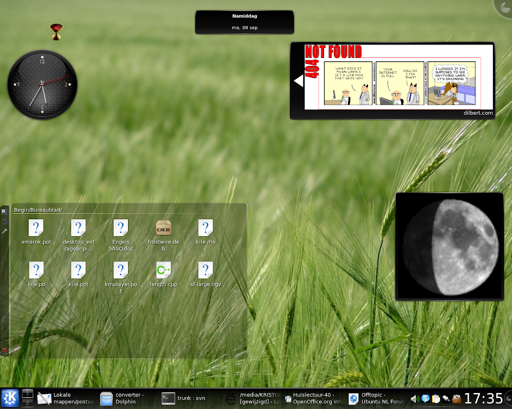 Plasmoids op desktop: Comic, Analoge klok, Vage klok, Folderview, Luna en Lancelot