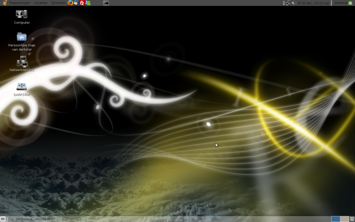Wallpaper (en dit is een aanrader!): 'All Day Long'. Deze wallpaper bestaat eigenlijk uit 8 verschillende png-files en één XML file. De wallpaper wijzigt naargelang het tijdstip. Overdag is deze dus hoofdzakelijk blauw en zonnig, terwijl naar de avond toe deze steeds donkerder wordt. Gewoon eventjes de XML file aanpassen met de juiste bestandslocatie en de juiste begindatum en -uur, de XML-file kiezen als wallpaper, et voilà! Link: http://www.gnome-look.org/content/show.php?content=83443
