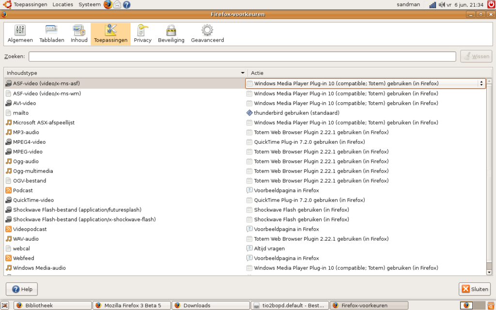 Dit zijn mijn instellingen in firefox met de mplayer plugin, instellingen staan onder bewerken > voorkeur > toepassingen.