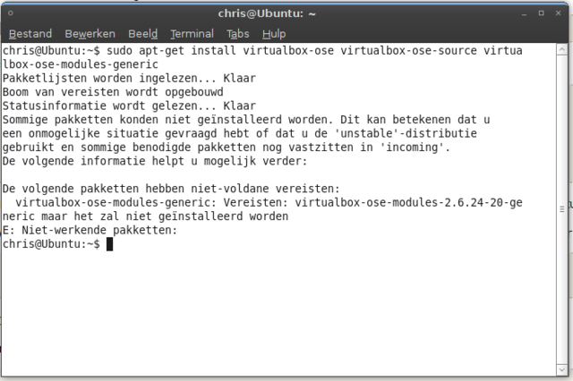 In Synaptic al die VirtualBox dingen markeren als totaal verwijderen en toepassen (dan worden die VB zaken verwijderd). daarna die genoemde binaire versie downloaden en in een terminal het commando sudo nautilusuitvoeren. Naar de directory gaan waar je dat bestand hebt opgeslagen en daarop dubbelklikken. Tijdens het installeren zie je ergens dat je in een terminal mee kunt kijken. DOEN!! Want op een gegeven moment moet je iets accepteren. Wanneer je dat hebt gedaan de installatie afronden: