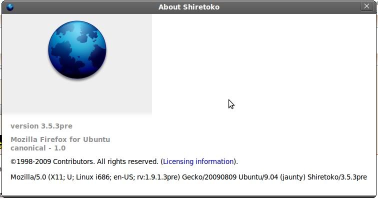 de huidige firefox versie is 3.0.13 en Shiretoko is 3.5.2 beide geinstalleerd vanuit pakketbeheer in 9.04