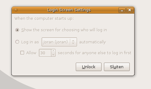 Ik heb net Ubuntu (Karmic 9.10) geinstalleerd, en nu weet ik dat je normaal via System>Administration>Login Window een theme kunt kiezen voor het aanmeldvenster. Daar kon je dan een aantal dingen, zoals het theme, wijzigen.