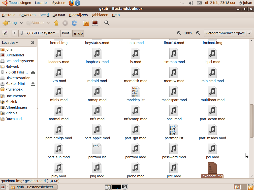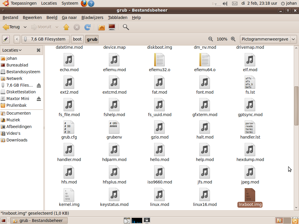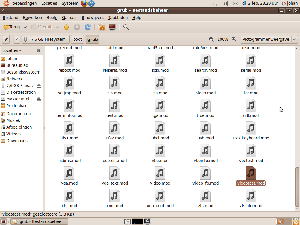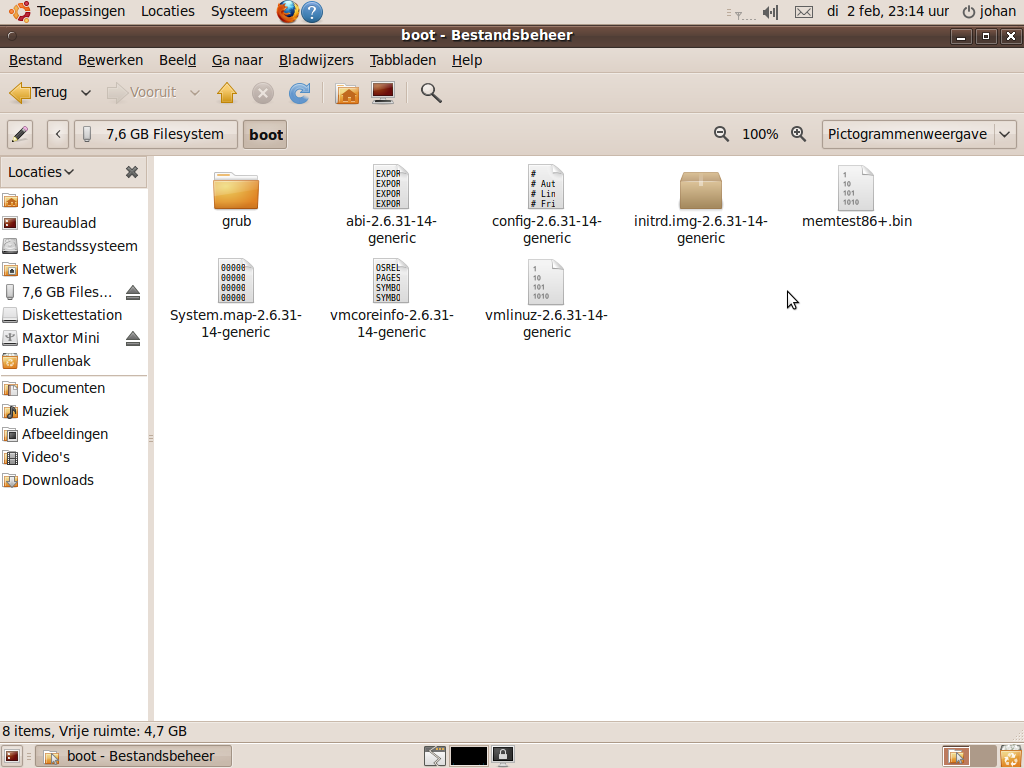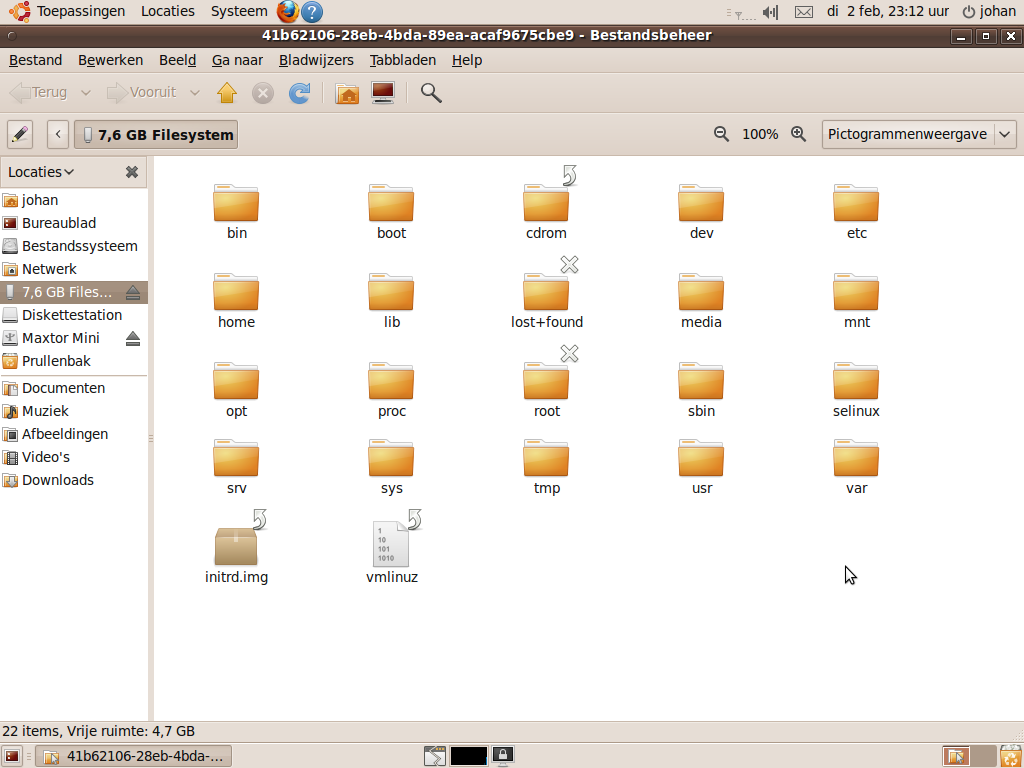 Alleen: het moest snel gaan & de installatie was toch al niet meer al te stabiel (9/10 keer viel mijn usb-muis uit na een minuutje of 2.  Oplossing: uittrekken en terug inpluggen (9/10 keer werkte dit) en anders: de reset knop indrukken).  Lijkt mij dat Ubuntu van de wijs geraakt door het aantal, via usb, aangesloten randapparaten.  Zijnde: externe harddisk (Maxtor Mini (2 usb aansluitngen: 1 voor power/data en 1 voor data)), draadloos internet en de muis. Daarom dus maar een volledige herinstallatie.  Ik post  morgen een screenshot van de inhoud van de stick.  Wil op zijn minst proberen om die, alsnog, aan de praat te krijgen.