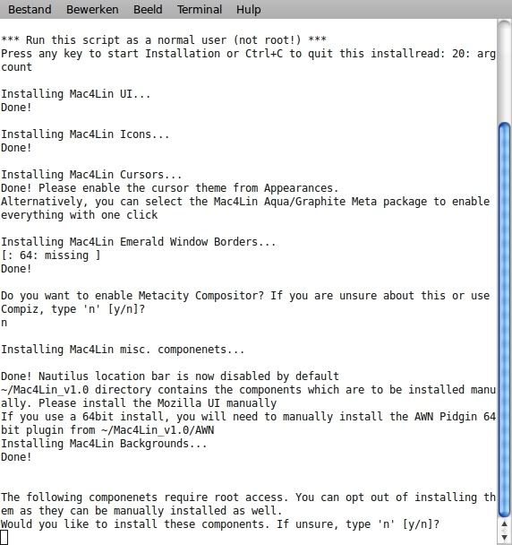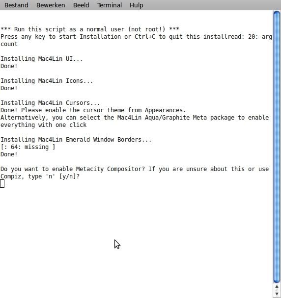Hier stelt hij de vraag of je de metacity compositor wilt activeren. Als je Compiz aan hebt staan is dit niet nodig. Als je niet weet of je Compiz gebruikt kun je dit controleren bij Systeem -> Voorkeuren -> Uiterlijk