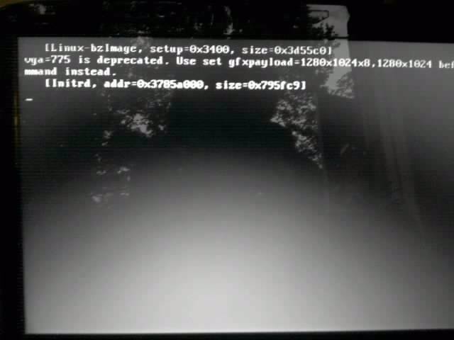 Waarschijnlijk werkt die oude aanduiding (vga=775) niet meer. Dit moet veranderd worden in: gfxpayload=1280x1024x8,1280x1024