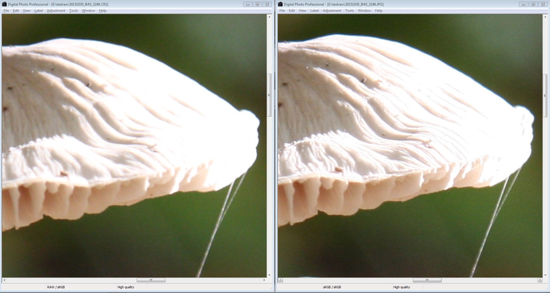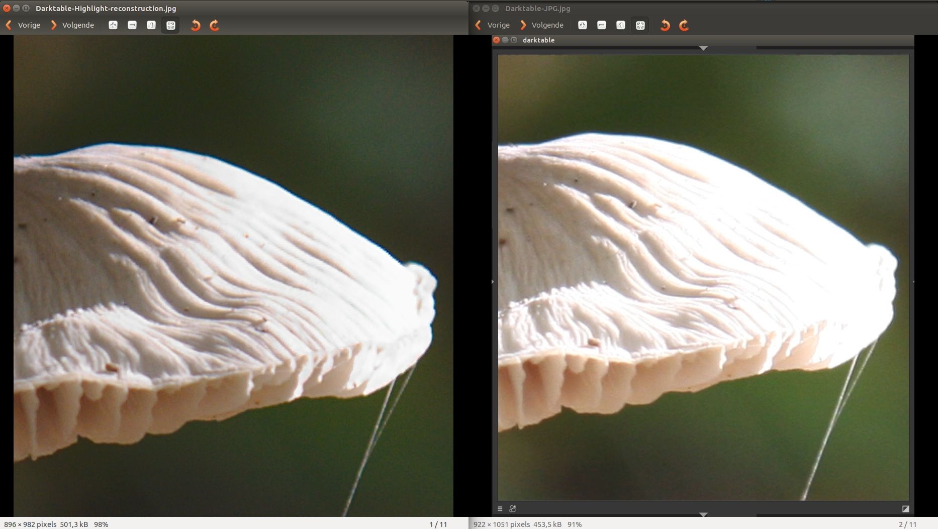 Om duidelijk te maken wat ik precies bedoel, heb ik een kleine selectie van een aan de rechterkant overbelichte paddestoel (op 200%!) gemaakt.