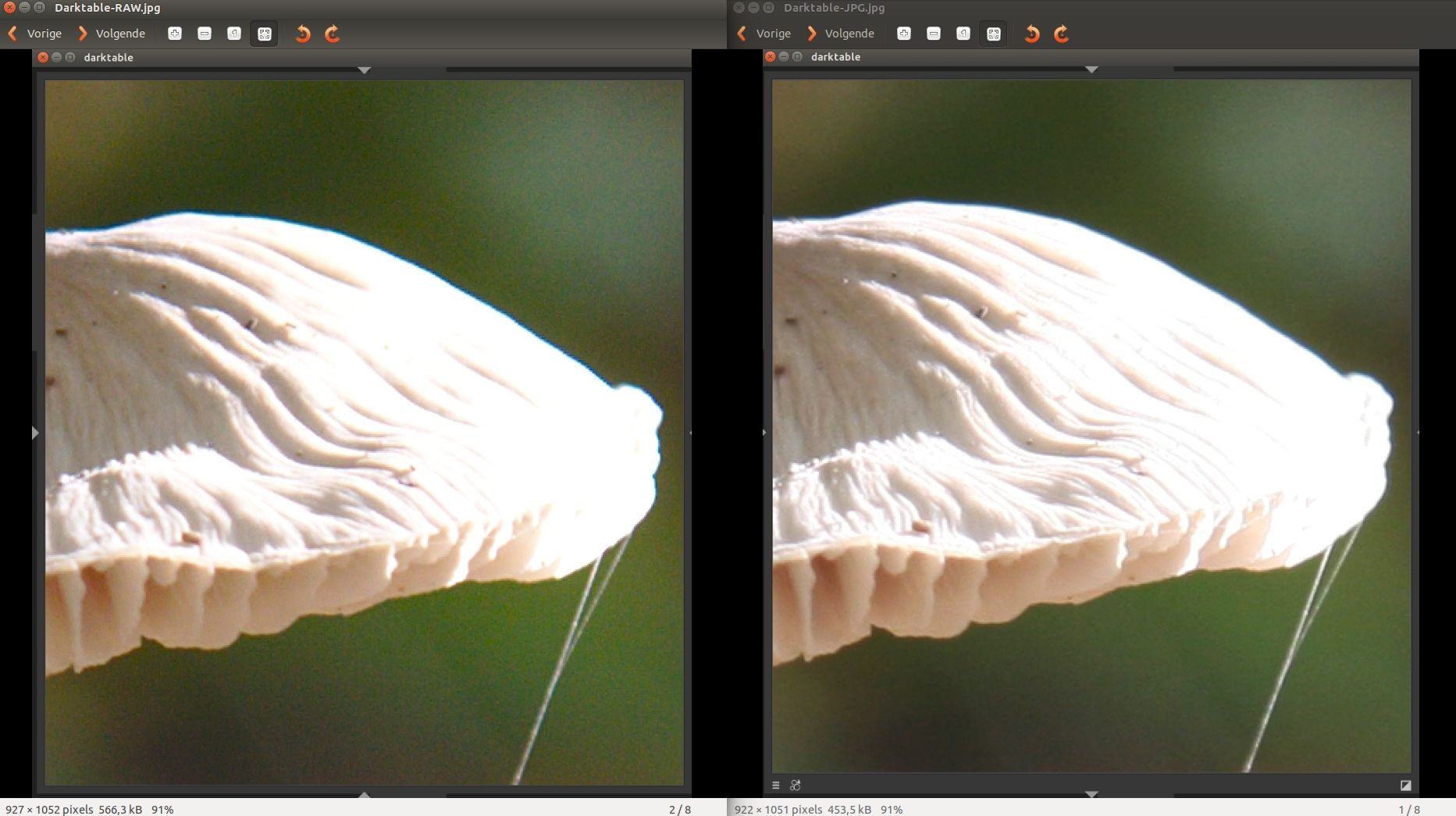 Hier de beide fotogedeeltes gemaakt in Darktable (links is RAW; rechts is JPG):