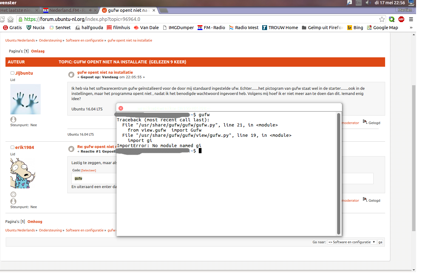 Graag gedaan.  :) Het probleem is dat 'ze' zijn vergeten de afhankelijkheid van python-gi in het pakket te zetten. Het softwarecentrum weet dan niet dat dit pakket bij gufw hoort en meegeïnstalleerd moet worden.